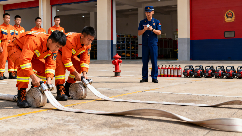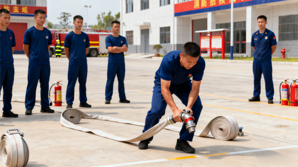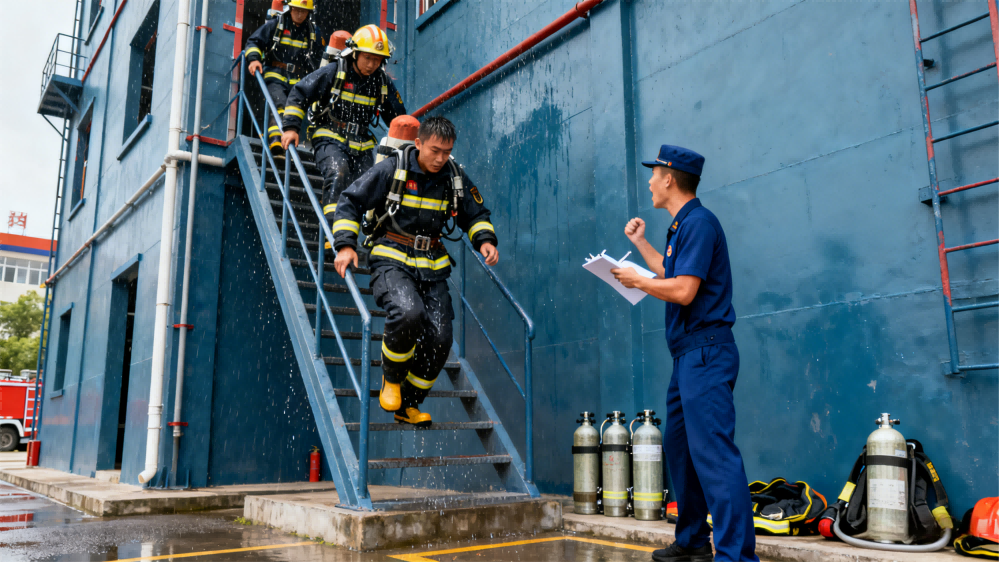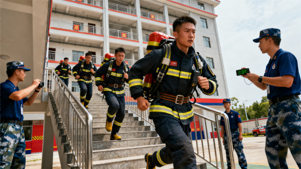 基础阶段聚焦生存与操作,2周内完成消防水带30秒标准连接、灭火器“提拔握压”精准操作、自救呼吸器60秒气密性佩戴等核心技能训练,同步开展3000米跑、负重登楼等体能强化,筑牢基础功底。